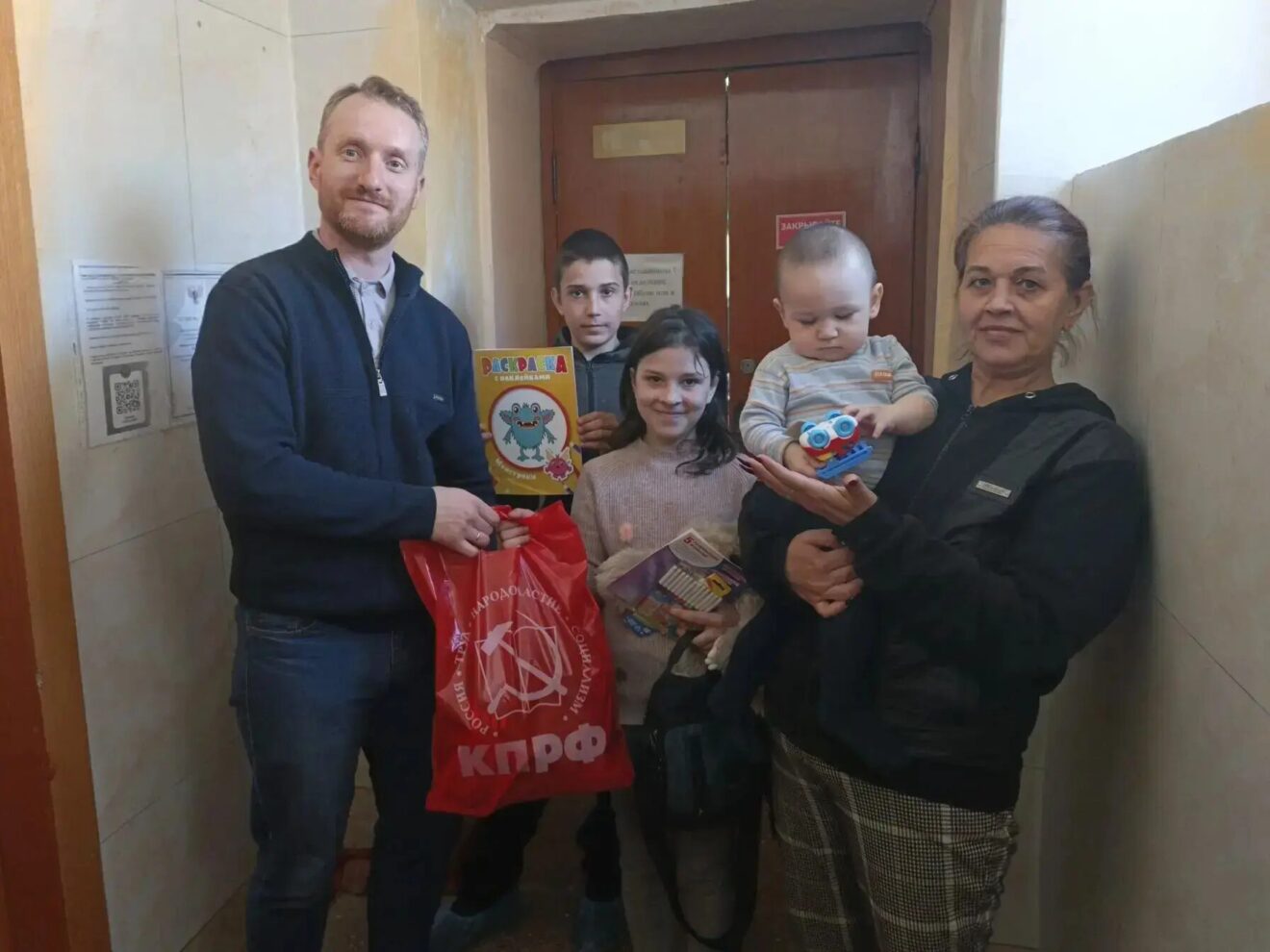 В Донецке депутат Народного Совета ДНР от фракции КПРФ Станислав Ретинский доставил гуманитарную помощь для семьи переселенцев из Димитрова. В рамках поддержки соотечественников были переданы детская одежда, игрушки и канцелярские принадлежности. В ходе встречи депутат-коммунист также рассказал о Программе Победы КПРФ, которая, помимо прочего, предполагает поддержку молодых и многодетных семей.
