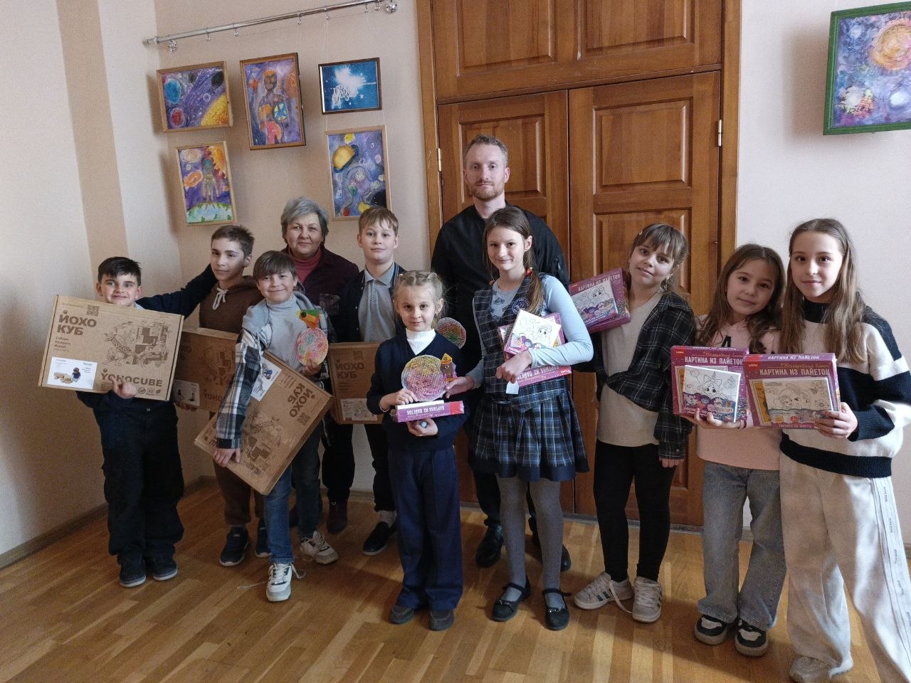Станислав Ретинский вручил будущим мультипликаторам картонные конструкторы, картины из пайеток и наборы для творчества, подготовленные группой «Вяжем для солдат» из Сургута.