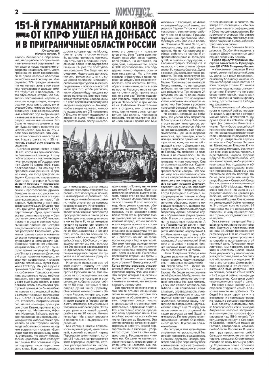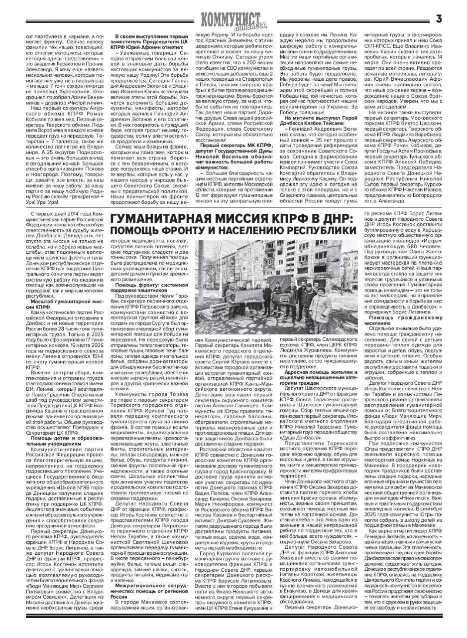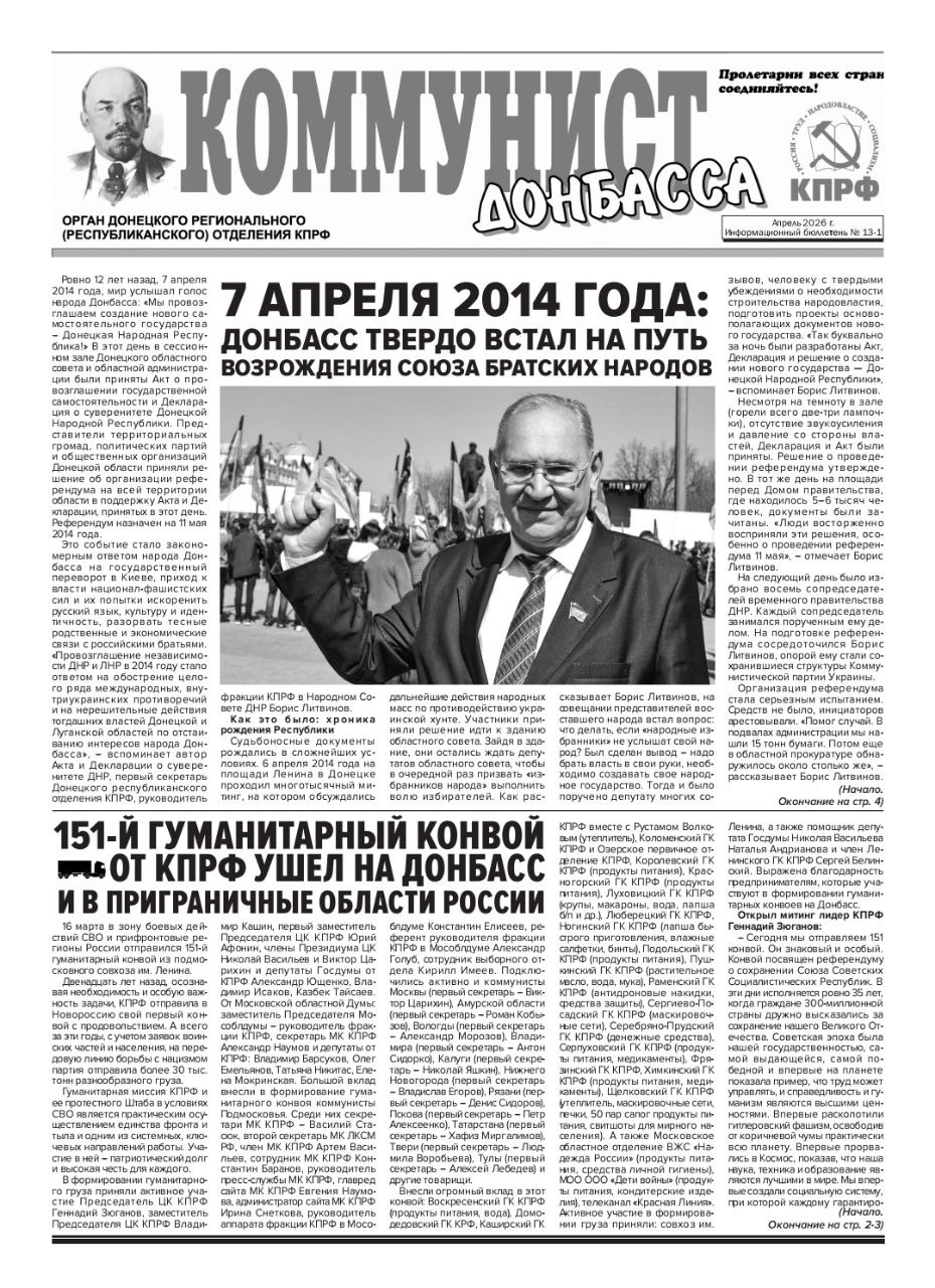 В апреле текущего года был опубликован очередной выпуск бюллетеня «Коммунист Донбасса». Центральное место в издании занимает материал, посвящённый отправке 151-го гуманитарного конвоя КПРФ на Донбасс. Миссия, проходившая под руководством председателя партии Геннадия Зюганова, оказала всестороннюю поддержку жителям региона.