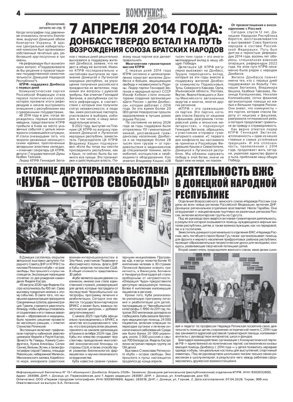 Бюллетень также освещает деятельность коммунистов и общественной организации «Надежда России» на территории ДНР, рассказывает о работе по укреплению социальной сферы, поддержке гражданских инициатив и реализации гуманитарных проектов. Кроме того, читателям представлен обзор выставки Станислава Ретинского «Куба – остров свободы».