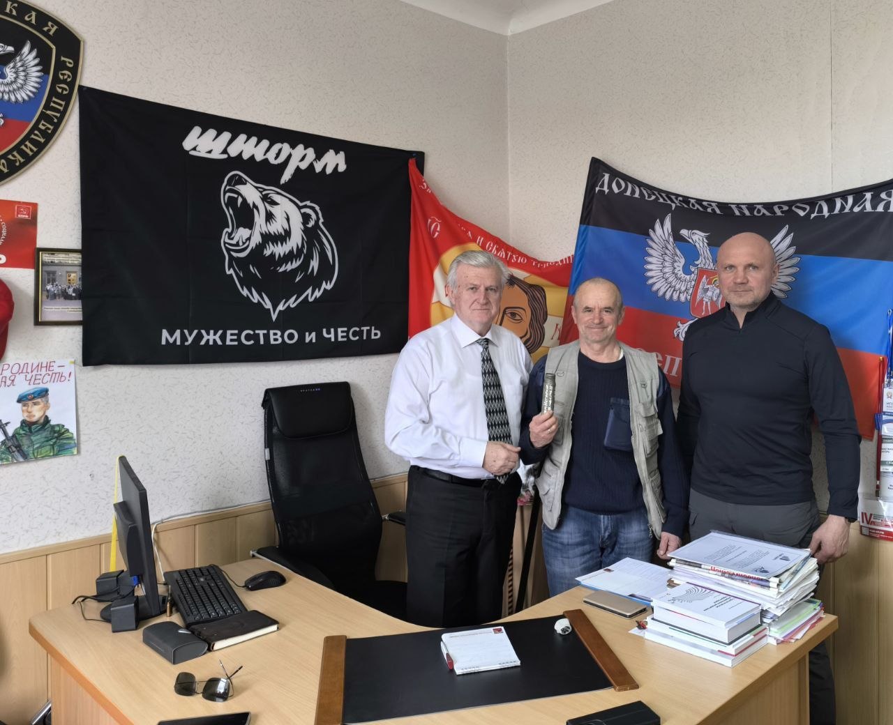 Депутат Народного Совета ДНР от фракции КПРФ, профессор Игорь Костенок провёл встречу с председателем регионального отделения движения «Ветераны России» и МОО «Ветераны Отечества» Александром Кишинцом, а также с Владимиром Полосухиным. В ходе встречи обсуждались актуальные вопросы экологической безопасности Донецкой Народной Республики. В завершение беседы Игорь Костенок преподнёс гостю из Волгограда памятный сувенир — «Донецкую матрёшку», выполненную из гильз от собственноручно отстреленных боеприпасов.