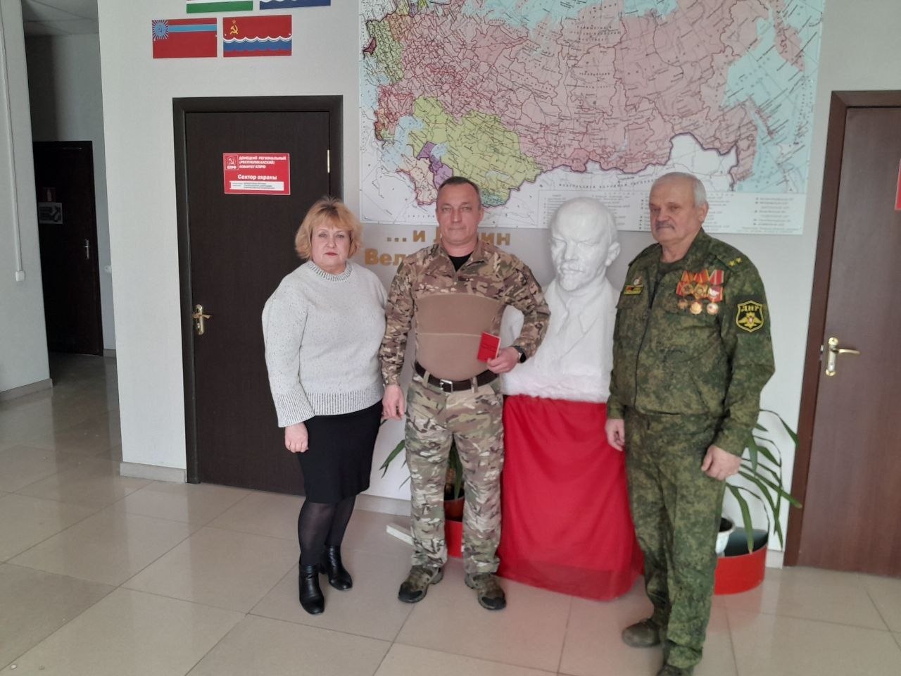 В Донецком республиканском отделении КПРФ состоялось торжественное вручение партийного билета участнику специальной военной операции Юрию Кадошникову. В мероприятии приняли участие заведующая организационным отделом Донецкого рескома КПРФ Сабина Живатовская, а также секретарь партийной ячейки Кировского района Донецка, начальник штаба Союза советских офицеров ДНР подполковник Виктор Зелёный.