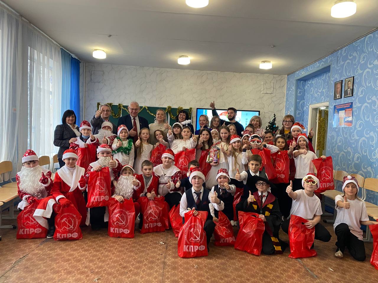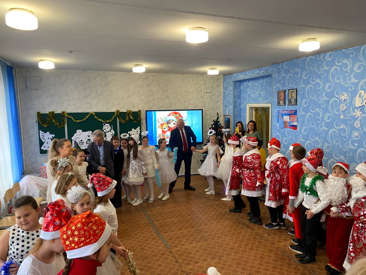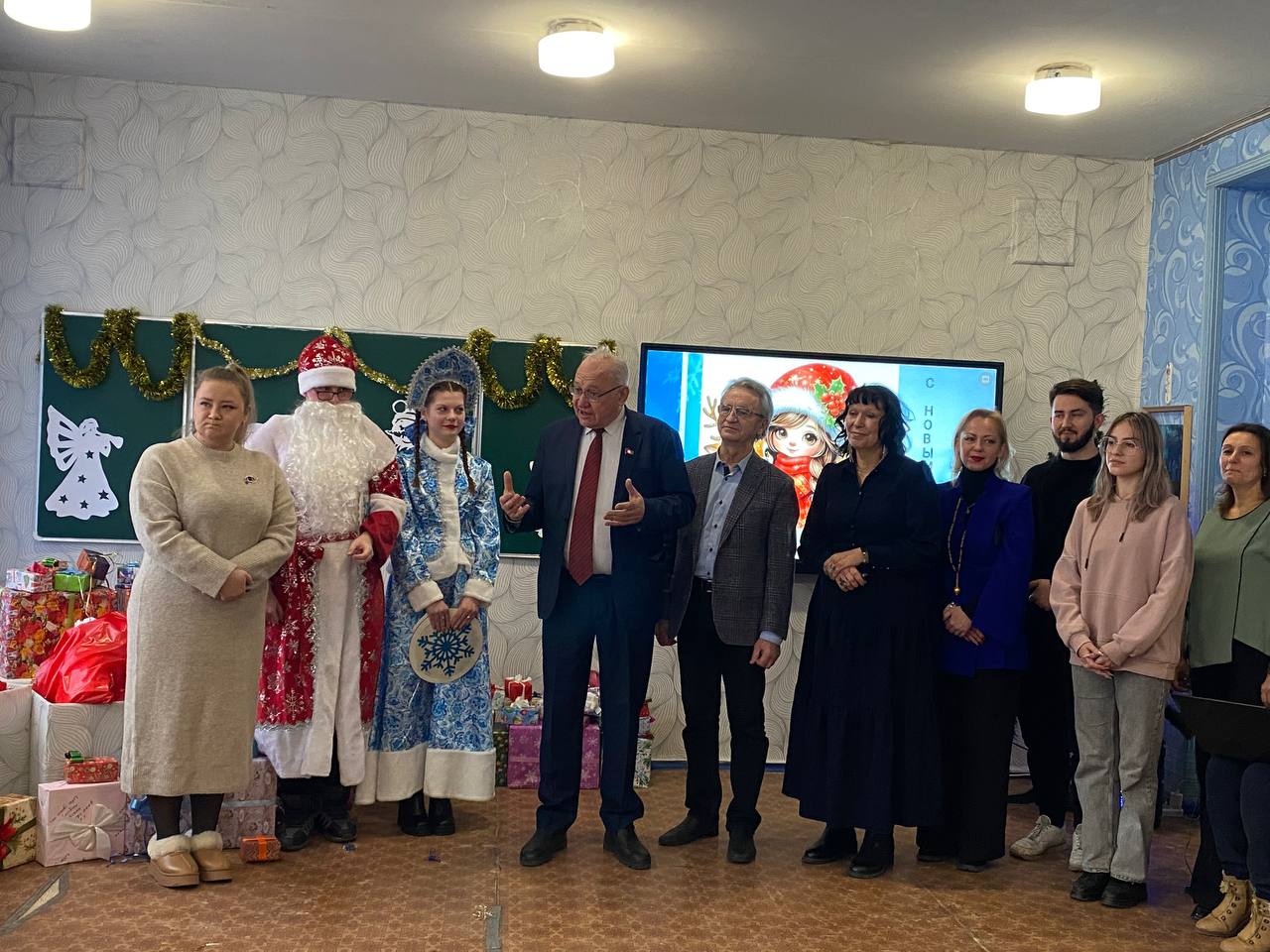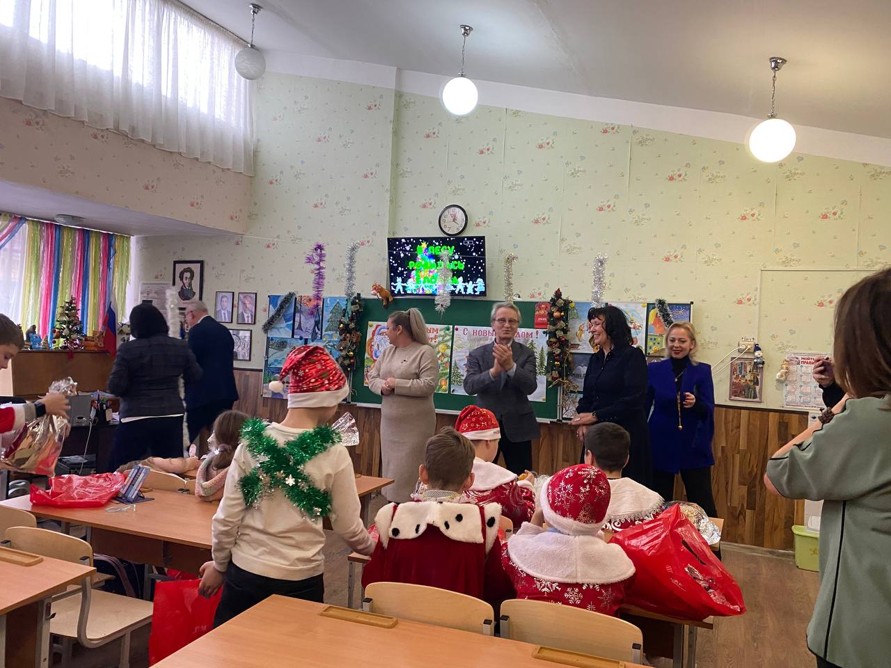 В преддверии Нового года в школе №64 города Донецка царила по-настоящему волшебная атмосфера. Любимый детский праздник стал особенно значимым благодаря визиту представителей Коммунистической партии Российской Федерации. Мероприятие посетила делегация КПРФ ДНР во главе с Первым секретарём Донецкого рескома КПРФ, руководителем фракции КПРФ в Народном Совете ДНР Борисом Алексеевичем Литвиновым, а также высокие гости из Москвы: советник Председателя ЦК КПРФ Владимир Романович Родин и член ЦК КПРФ, член Бюро МГК КПРФ Юлия Борисовна Михайлова.