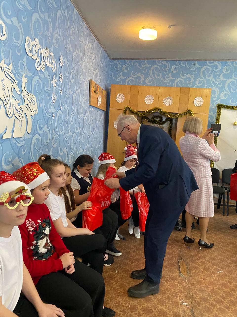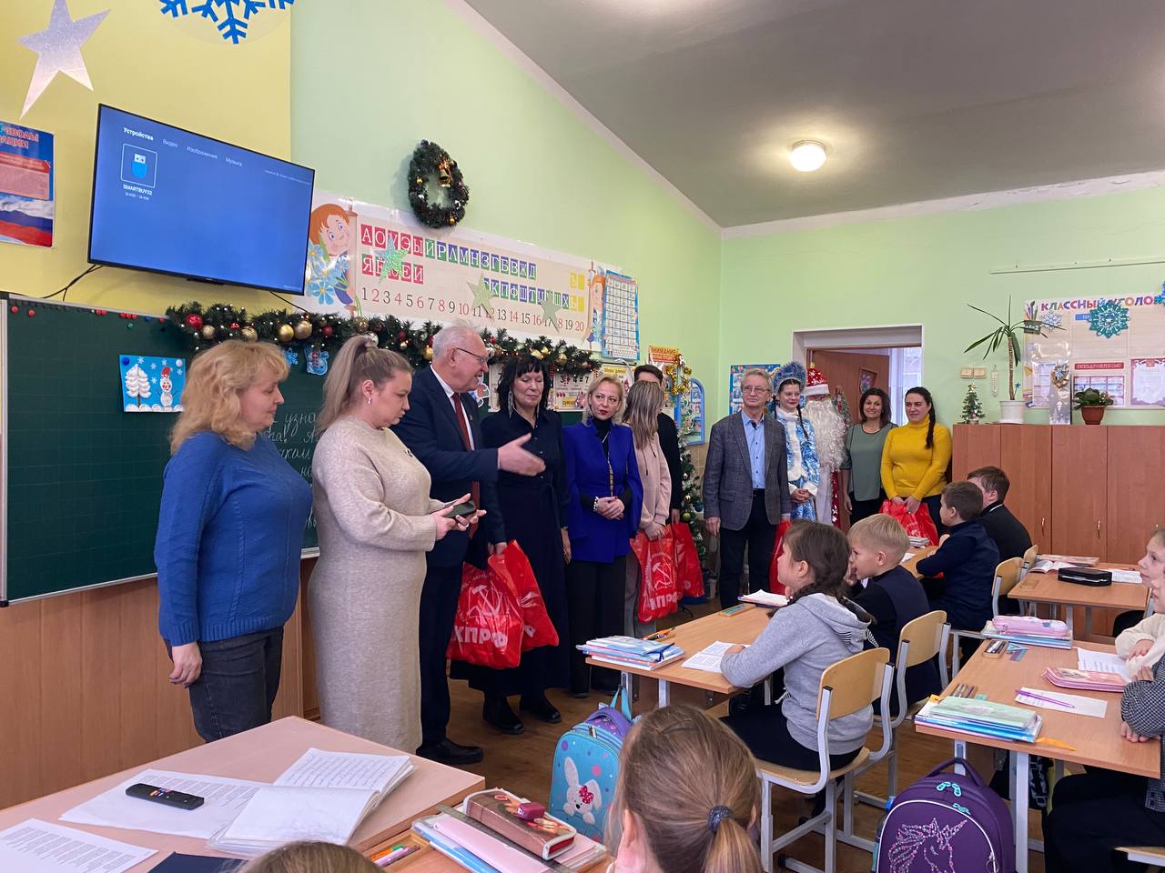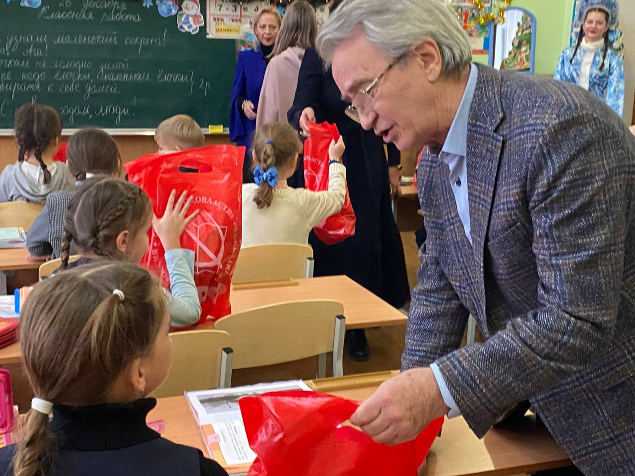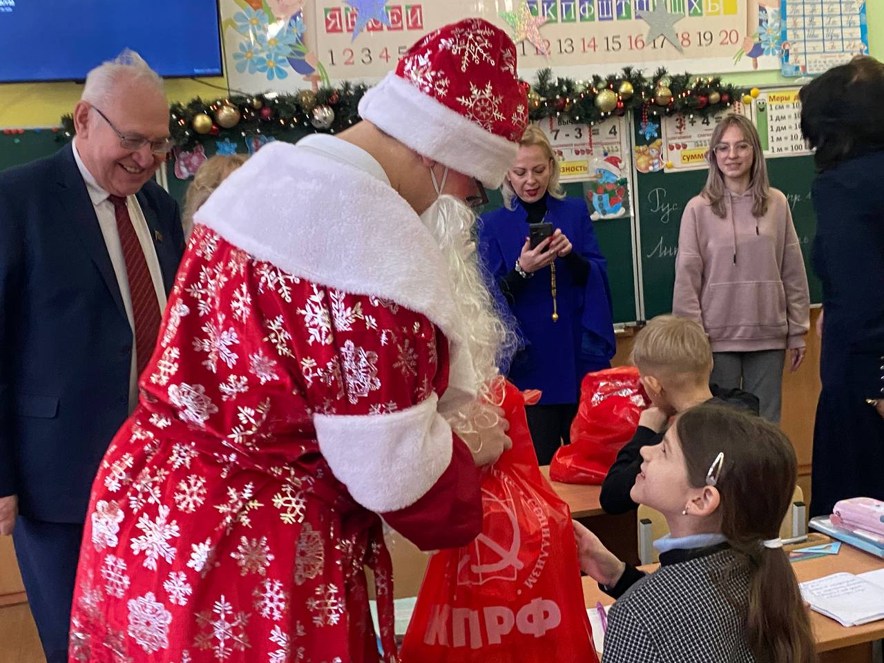 В преддверии Нового года в школе №64 города Донецка царила по-настоящему волшебная атмосфера. Любимый детский праздник стал особенно значимым благодаря визиту представителей Коммунистической партии Российской Федерации. Мероприятие посетила делегация КПРФ ДНР во главе с Первым секретарём Донецкого рескома КПРФ, руководителем фракции КПРФ в Народном Совете ДНР Борисом Алексеевичем Литвиновым, а также высокие гости из Москвы: советник Председателя ЦК КПРФ Владимир Романович Родин и член ЦК КПРФ, член Бюро МГК КПРФ Юлия Борисовна Михайлова.