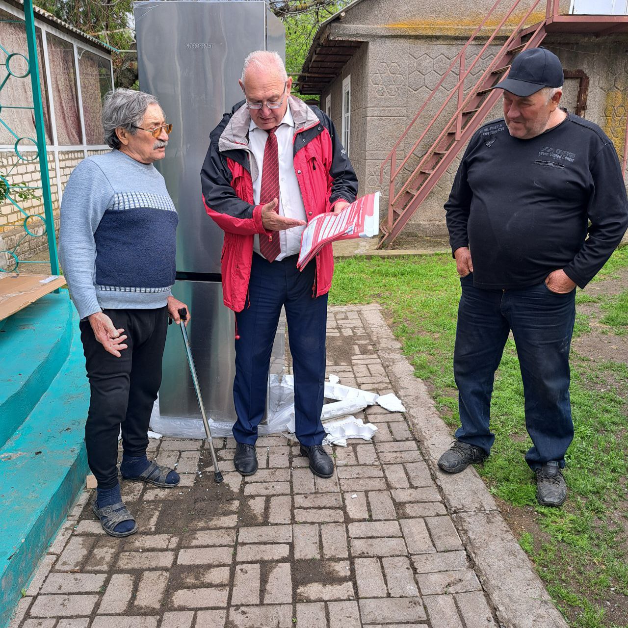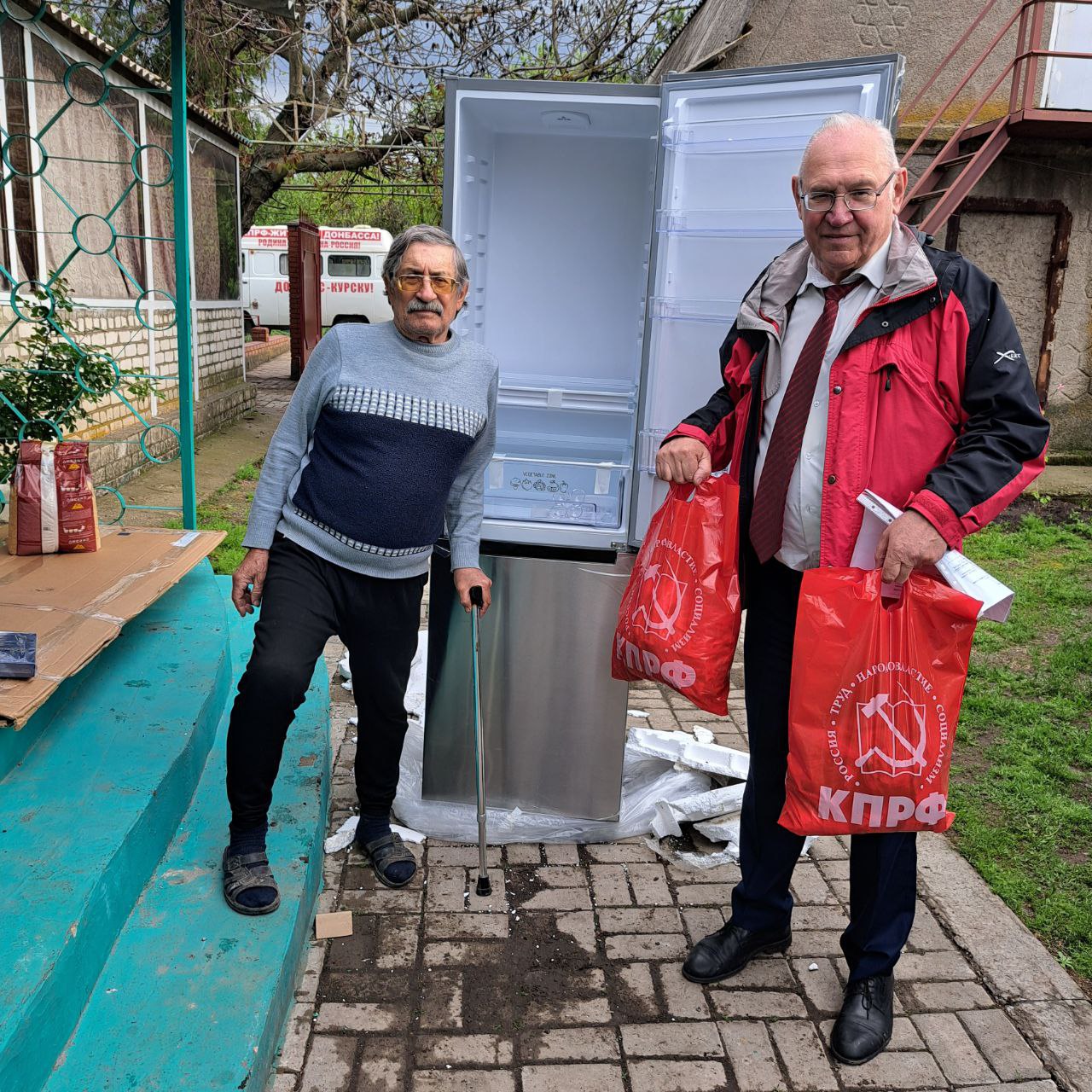 По прямому поручению Председателя ЦК КПРФ Геннадия Андреевича Зюганова, Первый секретарь Донецкого регионального отделения КПРФ, руководитель фракции КПРФ в Народном Совете ДНР Борис Литвинов доставил ветерану новенький двухкамерный 352-литровый холодильник НордФрост.