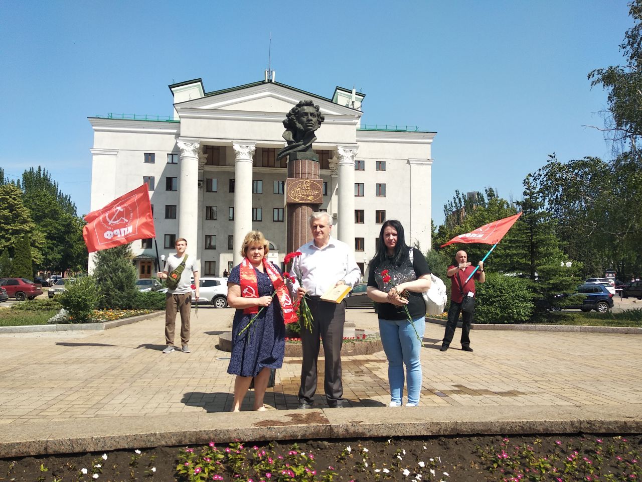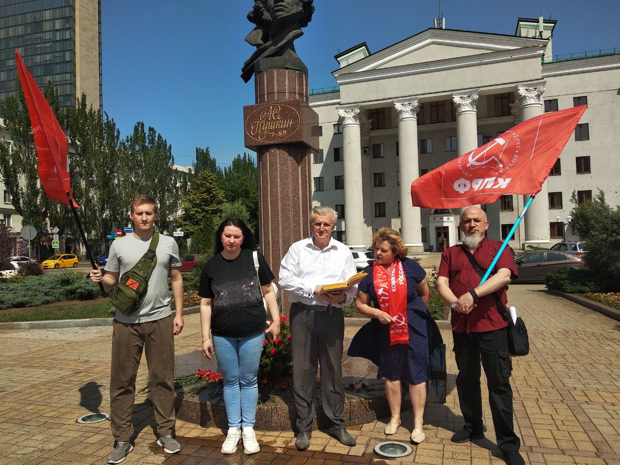 Сегодня на площади Пушкина у мемориала великого поэта донецкие коммунисты провели поэтический митинг. Мероприятие прошло под руководством Первого секретаря Донецкого рескома КПРФ, депутата Народного Совета ДНР Бориса Литвинова; его возглавили также депутат Народного Совета ДНР, член фракции КПРФ, профессор Игорь Костенок, второй секретарь Донецкого рескома ЛКСМ РФ Виталий Мельников и их единомышленники. С цветами и красными флагами коммунисты почтили память Пушкина, возложили цветы к памятнику и произнесли немало памятных слов о поэте.