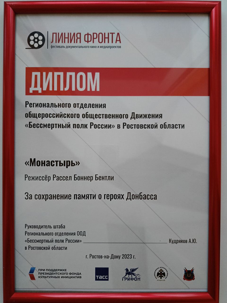 Фильм, основанный на реальных событиях, стал не просто киноработой — он превратился в священный памятник тем, кто отдал всё ради свободы Донбасса. В 2023 году «Монастырь» был удостоен Диплома регионального отделения Общероссийского движения «Бессмертный полк России» на фестивале документального кино и медиапроектов «Линия фронта» в Ростове-на-Дону — при официальной поддержке Президента Российской Федерации Владимира Владимировича Путина. Это признание подчёркивает не только художественную ценность картины, но и её историческое значение как свидетельства интернационального сопротивления фашизму.